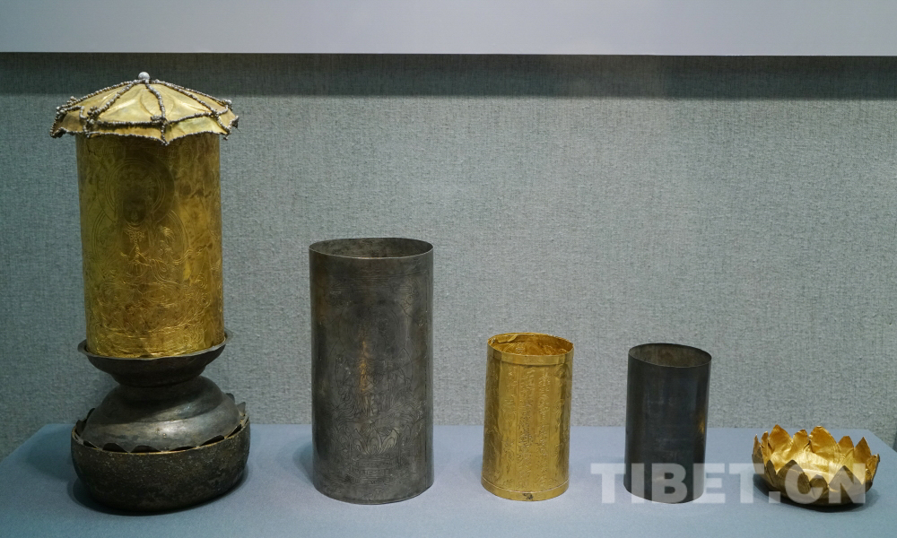 金银经塔分为火炉、莲座、塔身、顶盖四部分。火炉作浅钵形,平底,铜质,盆内残存绵绢类物灰烬。炉盖上接仰莲座,座内置一朵单层八瓣金莲叶。塔身系四重圆筒形套,内装经卷。塔身四重套,从外至内:第一重为金片,外面堑刻坐佛一尊和八大灵塔及塔名;第二重套为银片,刻三尊菩萨;第三重为金片,刻大日如来佛与八大菩萨;第四重套银质,素面。