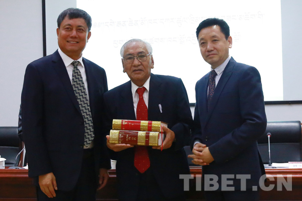 图为中国藏学研究中心书记安七一(左)向康噶·崔臣格桑教授(中)赠送《大藏经》。摄影:杨月云