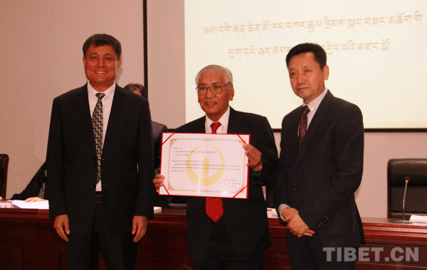 图为中国藏学研究中心总干事郑堆(右)向康噶·崔臣格桑教授(中)颁发文献收藏证。摄影:李元梅