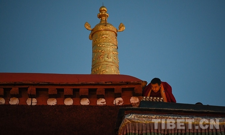 图为大昭寺点灯的僧人 摄影:王媛媛