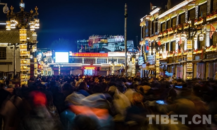 “燃灯日”,藏语称“甘丹昂确”,是纪念藏传佛教格鲁派创始人宗喀巴大师圆寂成佛的日子。在这一天,格鲁派寺庙都会举行盛大的燃灯纪念仪式。图为大昭寺转经的信教群众 摄影:赵耀