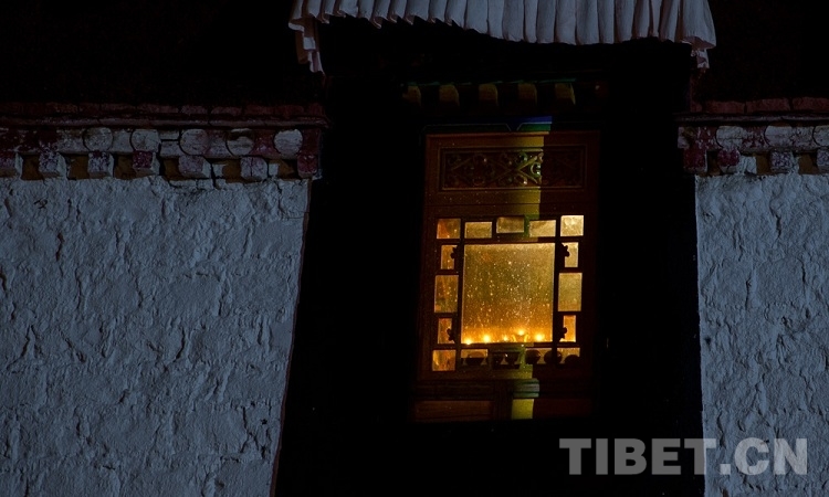图为大昭寺窗内点燃的酥油灯 摄影:赵耀