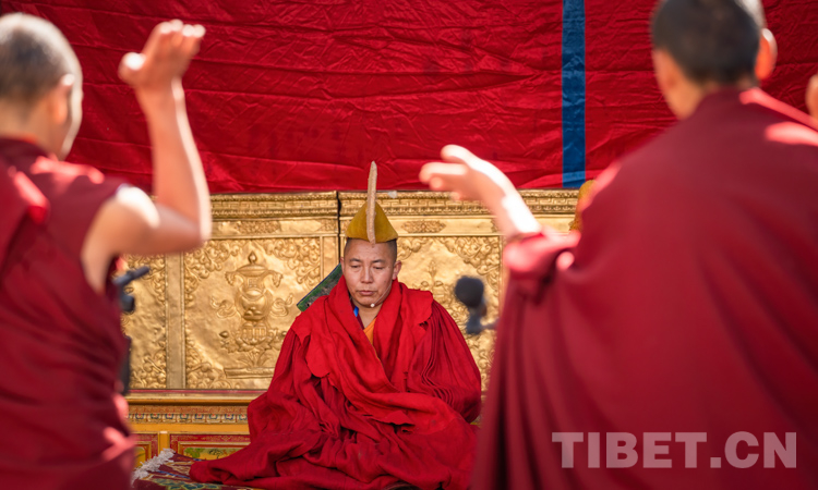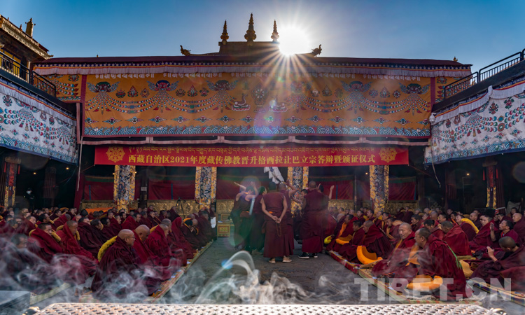 图为西藏自治区2021年度藏传佛教学经僧人考核晋升格西拉让巴学位立宗答辩暨颁证仪式现场 摄影:赵耀