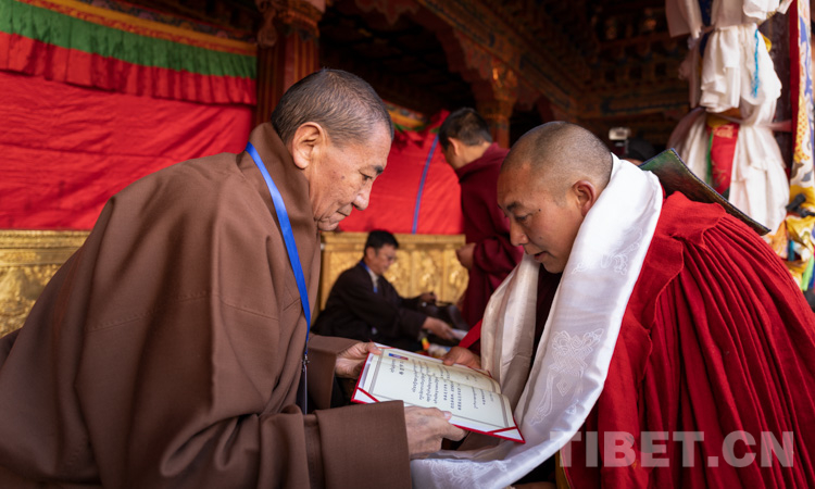 图为中国佛教协会西藏分会常务副会长珠康·土登克珠活佛(左)向考僧颁发学位证书 摄影:赵耀