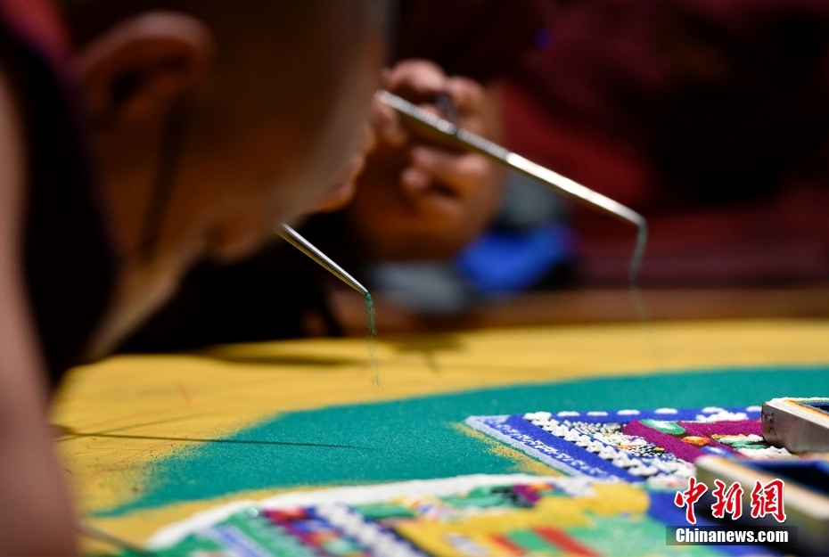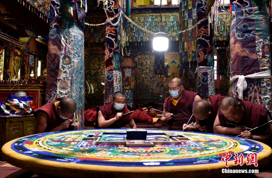 图为功德林寺僧人正在绘制沙画坛城。 中新社发 李林 摄