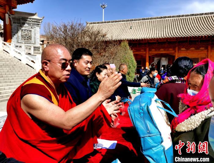 图为青海省佛教协会副会长、黄南藏族自治州更登桑布慈善协会会长更登桑布(左一)向民众捐赠物资。张添福 摄