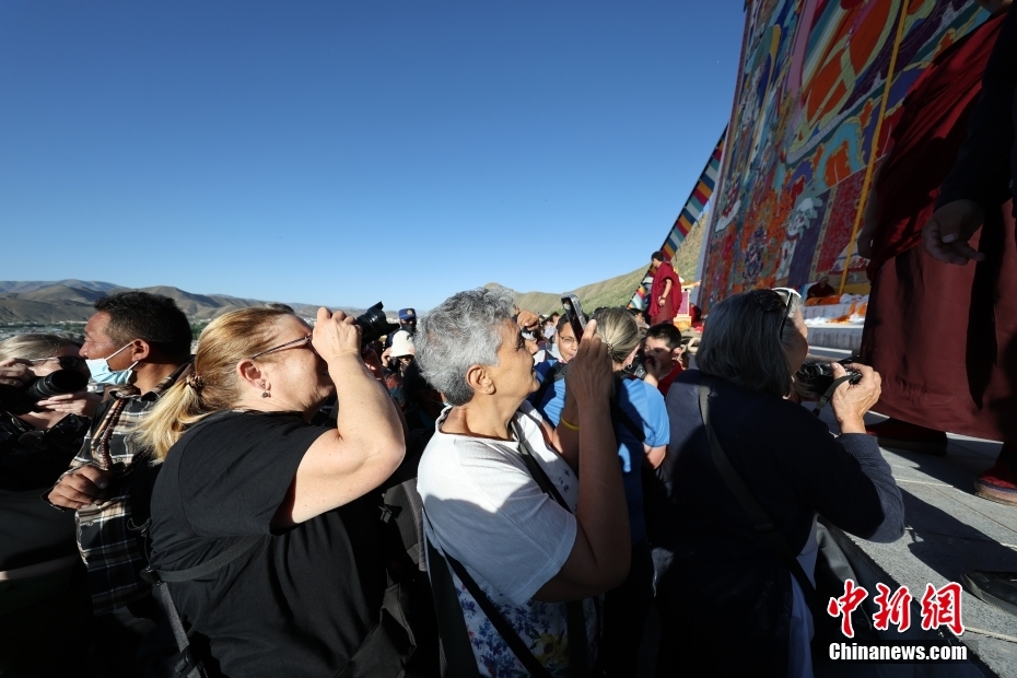 7月9日,西藏日喀则市扎什伦布寺展出无量光佛巨幅唐卡佛像。西藏日喀则市扎什伦布寺当日起举行连续三天的展佛活动。第一天展出高40米、长38米的无量光佛巨幅唐卡佛像。在藏传佛教中,无量光佛被认为是“过去佛”。扎什伦布寺是历代班禅大师的驻锡地,也是藏传佛教格鲁派六大寺院之一。图为外国游客参观展佛活动。
