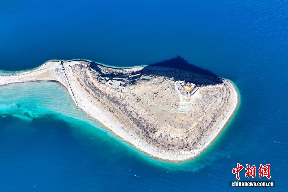 1月17日,西藏羊卓雍错日托寺风光。日托寺位于羊卓雍错东北岸一半岛上,是半岛上仅有的建筑,形成了“古刹”“孤寺”景观,近年在网络平台持续火热,成为游客打卡西藏的热门地标。中新社记者 贡嘎来松 摄(无人机照片)