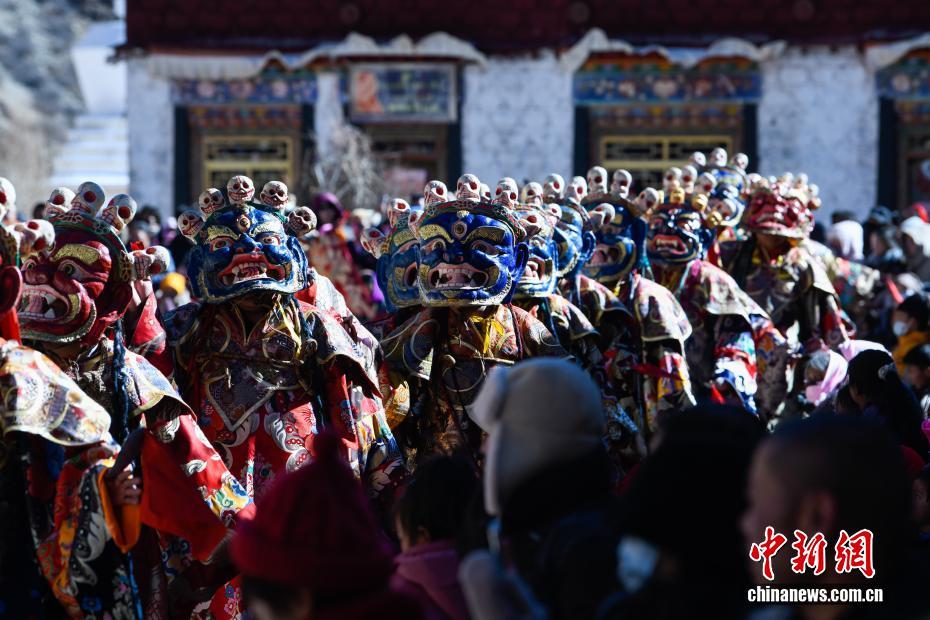 2月16日,西藏楚布寺举行“羌姆”表演。当日,是藏历十二月二十九日,西藏楚布寺举行“羌姆”表演迎藏历新年。图为楚布寺僧人们佩戴面具表演。中新社记者 贡嘎来松 摄