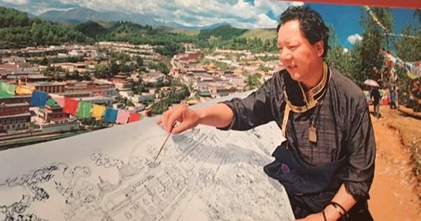谈及此次展览,桑杰本说:“这次展览精选了56幅唐卡作品,寓意着中国56个民族亲如一家。并以‘传承优秀传统文化,助力民族复兴中国梦’为主题,在绘制的过程中我将唐卡绘画艺术与现代国画、西方画相结合,精心描绘,使多种风格有机结合。”桑杰本的绘画艺术吸收了外来的多种艺术元素,将自身艺术风格与之相兼容,使本土风格明显的热贡艺术体系更加民族化。