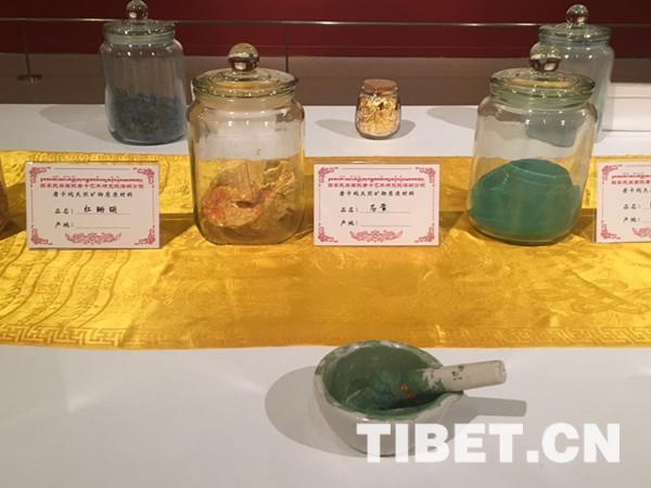 图为展览现场展示的传统唐卡颜料。摄影:周晶