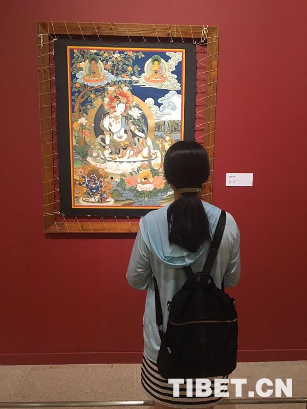 图为观众在展览上仔细观看唐卡作品《静息观音》。摄影:周晶