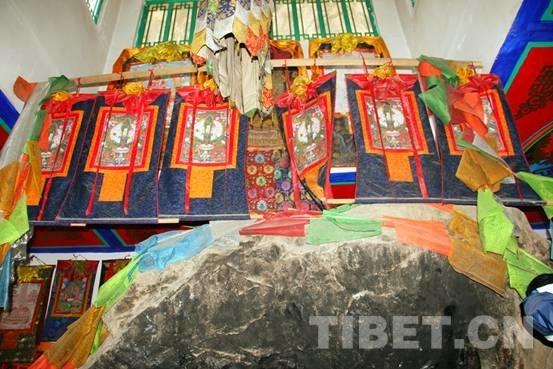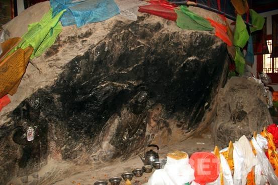 走进文成公主庙,记者的目光立刻被庙中的一块巨大岩石所吸引。只见岩石上有自然形成的藏王松赞干布和唐朝文成公主像,人像凹凸有致、栩栩如生,自然的鬼斧神工让人赞不绝口。图中岩石中部为松赞干布像,左边为文成公主像,岩石右侧还有一座释迦牟尼石刻像,据著名藏学家陈庆英考证,这是吐蕃王朝赤松德赞时期雕刻的。摄影:李元梅