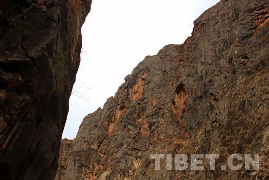 “扎古西”藏语意为“打开山崖门”,峡谷两边山崖雄峰对峙,山高谷深,峭壁上处处有溶洞,传说那是高僧、活佛修炼的地方,峡谷悬崖落差600米,宽处仅100米左右。图为扎古西峡谷“一线天”。摄影:李元梅