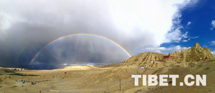 中国西藏网讯 近日,西藏阿里古格王朝遗址旁,突然出现了一弯双彩虹。碧蓝苍穹下,扎达土林间,瑰丽的双彩虹,与苍茫静穆的古格王朝遗址遥相呼应。正巧在此参观的杨先生,用手机定格住了这壮美的一刹那。