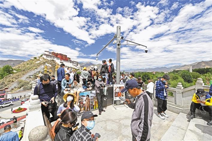 近期,随着疫情防控进入常态化,西藏旅游市场逐渐升温,布达拉宫、八廓街、大昭寺等旅游景点,游客明显增多,旅游业逐步恢复了活力。图为游客熙攘的白塔观景台。 记者 李洲 摄