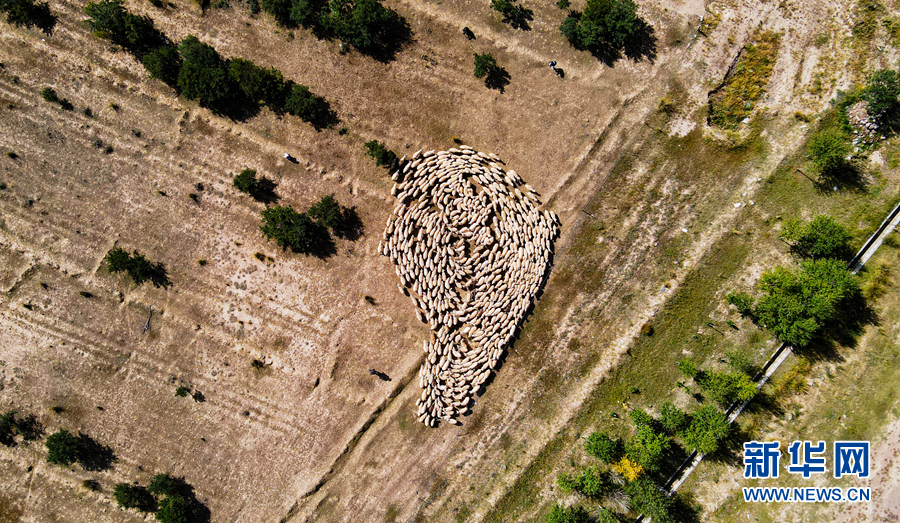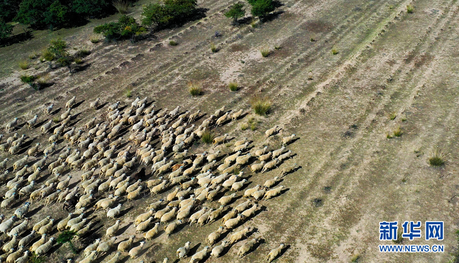 图为航拍金泰牧场内的茶卡羊。新华网发(董松松摄)