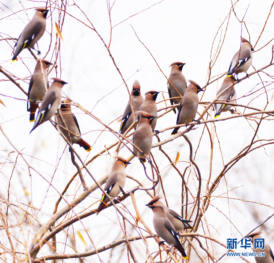 一群太平鸟在树枝上休憩。新华网发(李崇轩摄)