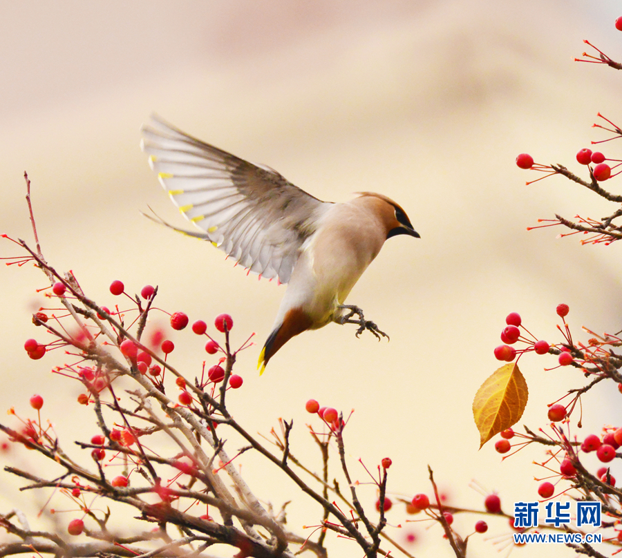 一只太平鸟在海棠树间飞舞。新华网发(李崇轩摄)