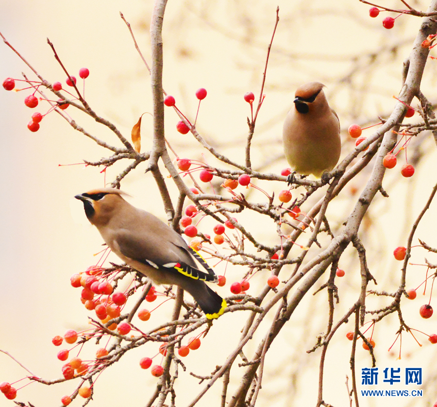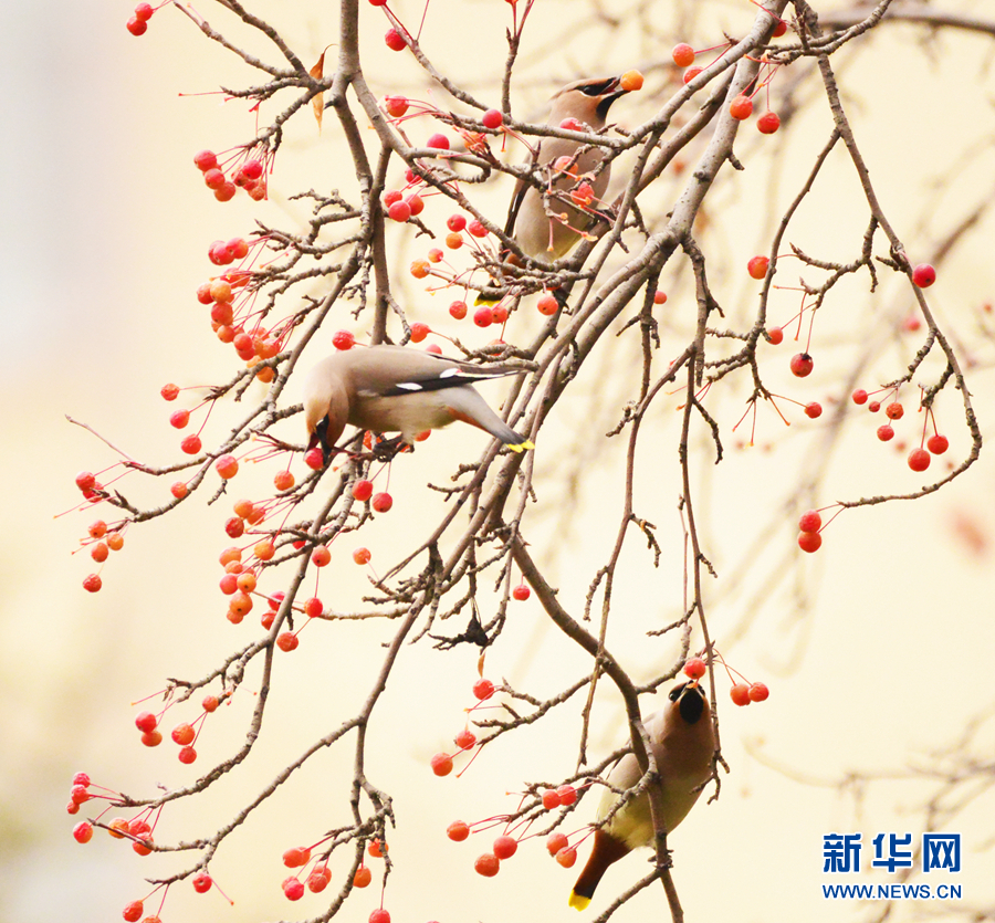 一群太平鸟正在“享用”海棠果。新华网发(李崇轩摄)