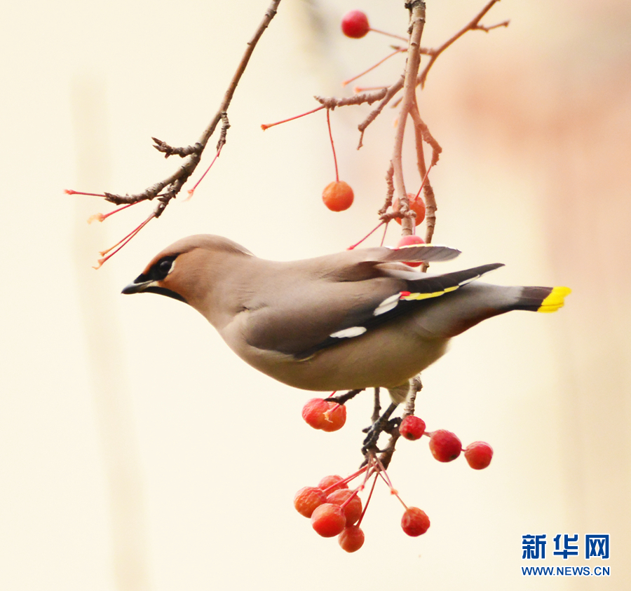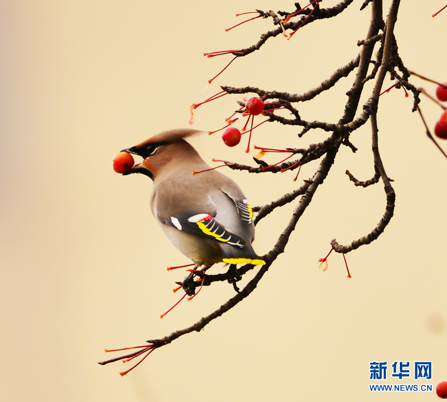 一只太平鸟正衔着一颗海棠果。新华网发(李崇轩摄)