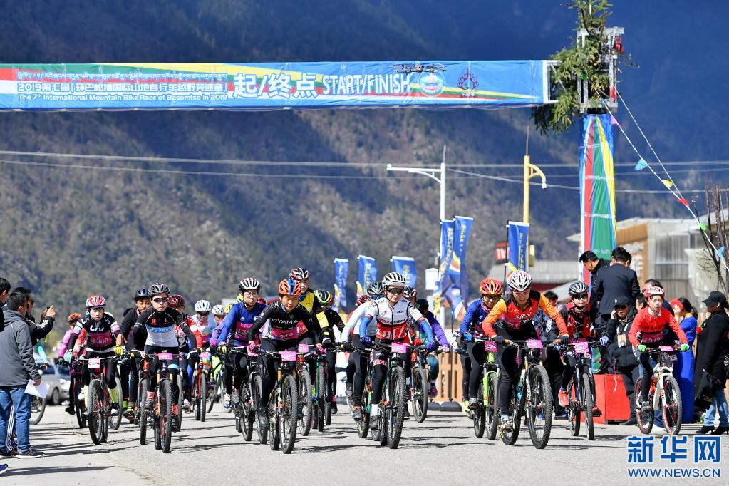 第七届环巴松措山地自行车越野竞速赛中,女子组选手在比赛中出发(2019年5月1日摄)。新华社记者 李鑫 摄