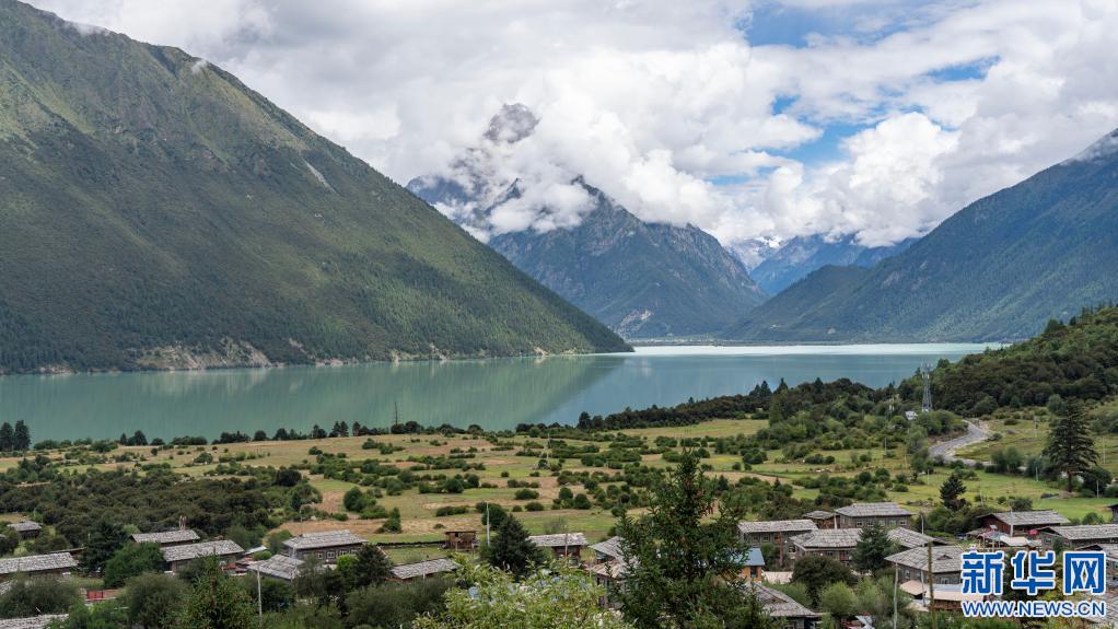 这是风光秀美的巴松措,近处房屋为结巴村民居(2020年9月15日摄)。新华社记者 王沁鸥 摄