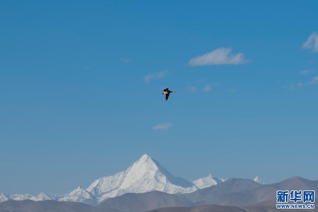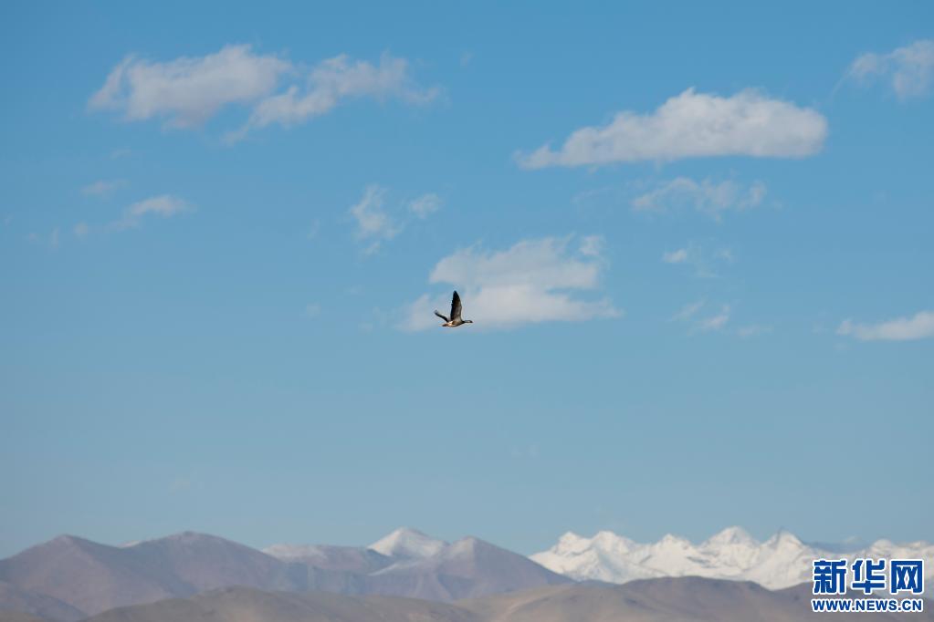 5月16日,在西藏仲巴县里孜口岸附近,一只斑头雁从空中飞过。新华社记者 孙瑞博 摄