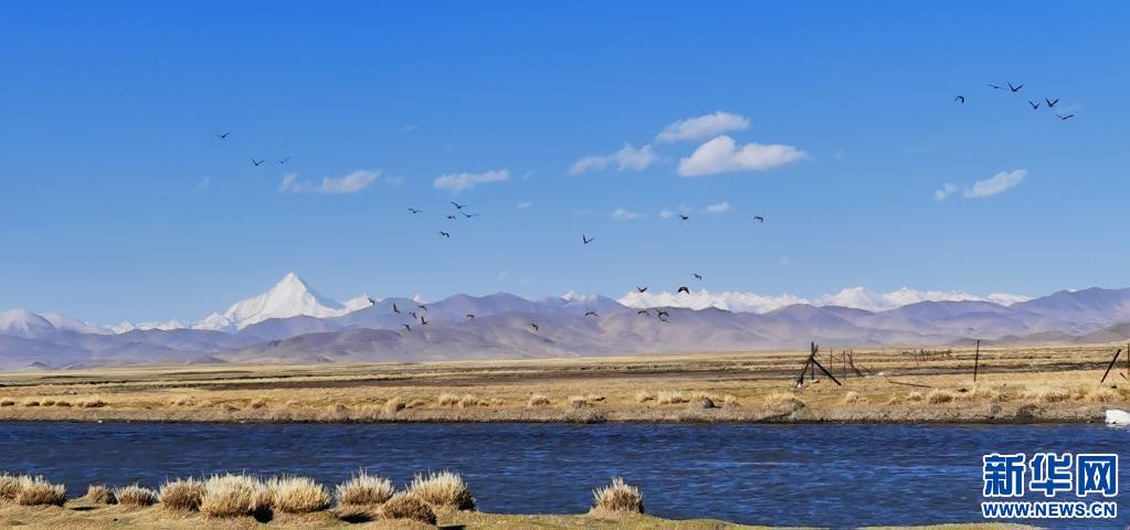 5月16日,在西藏仲巴县里孜口岸附近,一群斑头雁飞翔在湖泊和雪山之间(手机照片)。新华社记者 沈虹冰 摄
