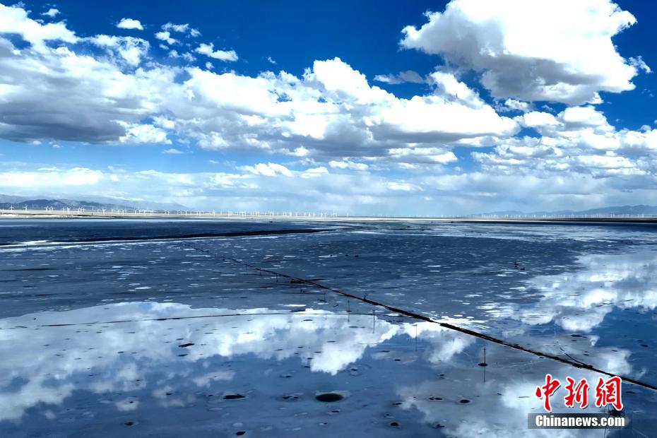 图为盐湖结晶的盐层和云朵倒影。 王生荣 摄