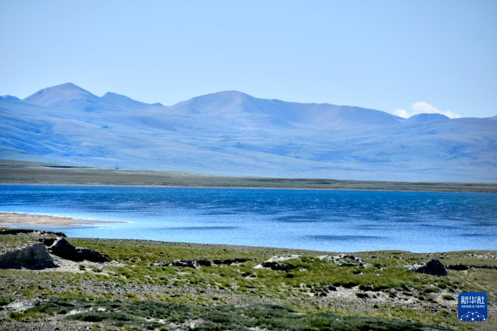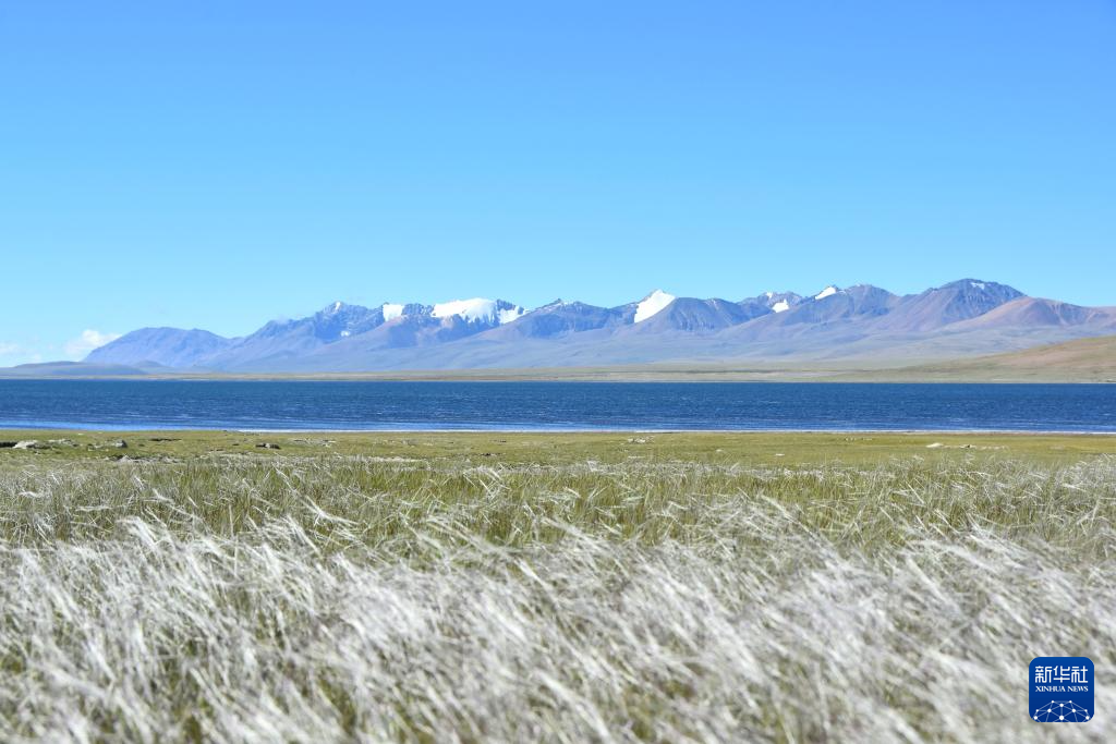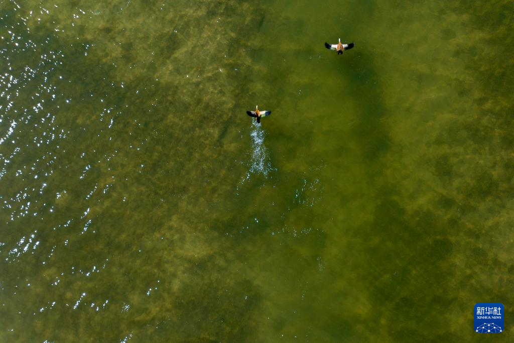 飞鸟从打加错湖面掠过(无人机照片,8月30日摄)。新华社发(旦增努布 摄)