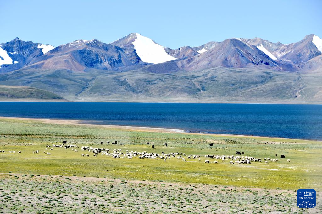 打加错湖畔的羊群、牛群(8月30日摄)。新华社记者 刘文博 摄
