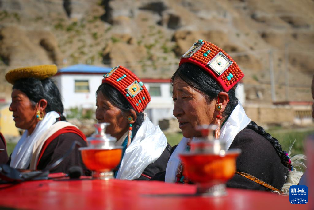 仁贡村距离普兰县城29公里,海拔约4200米。33岁的村民益西平措告诉记者:“以前我只会务农和放牧,但出于兴趣,会在农闲时跟村里的老人学习‘孔雀饮酒舞’和敬酒歌‘雅尔松吧’等。”如今益西平措在村里也收了十几个学生。