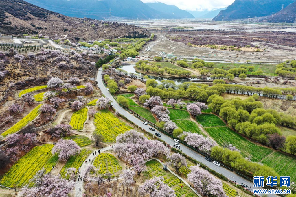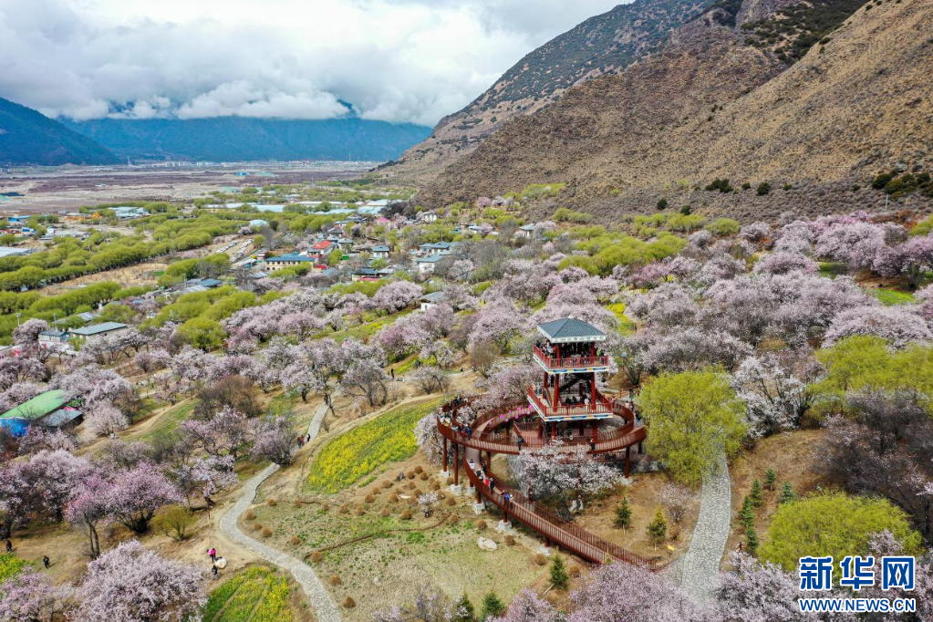 3月31日,林芝市巴宜区嘎拉村盛开的桃花(无人机图片)。新华网发 李腾 摄