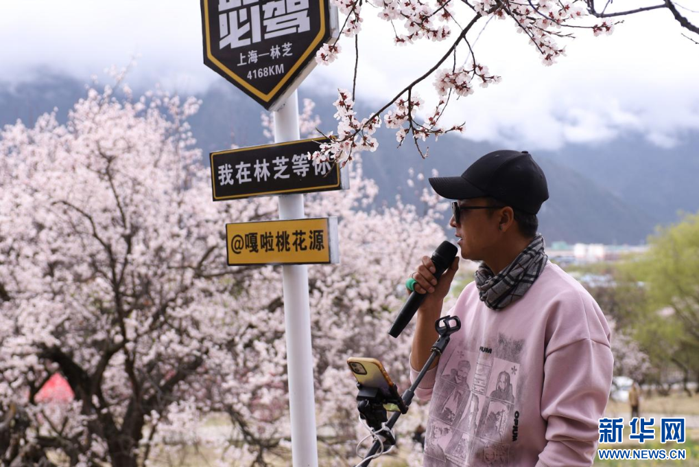 3月31日,游客在林芝市巴宜区嘎拉村进行线上直播。新华网发 李腾 摄