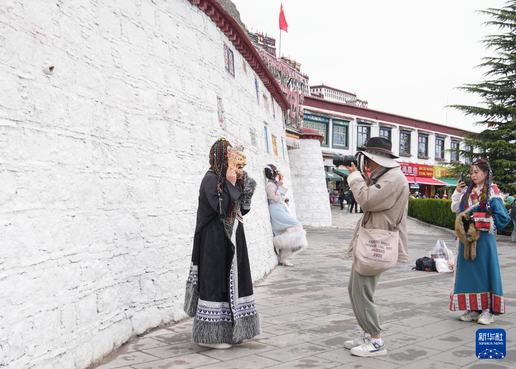 5月5日,游客在布达拉宫广场拍照留念。新华社记者 丁汀 摄