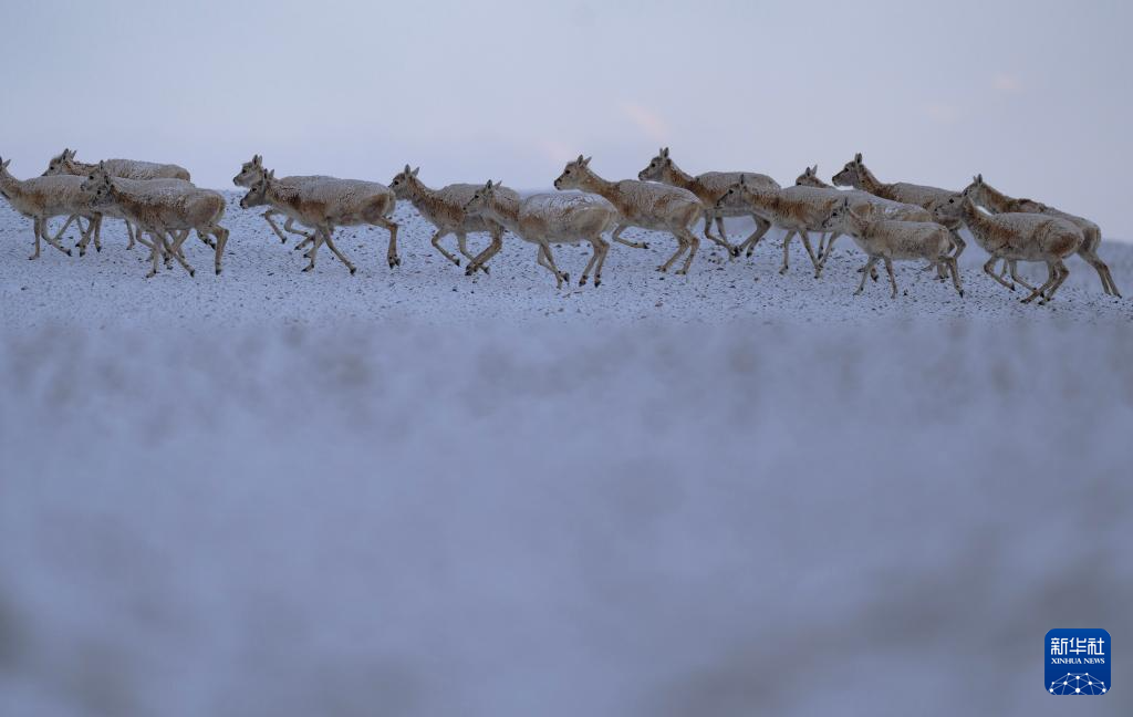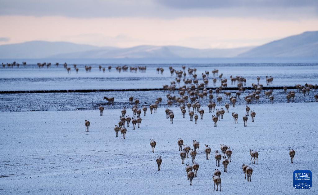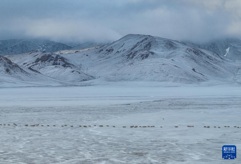 藏羚羊在甜水河畔雪地荒滩上向产羔地迁徙(6月15日摄)。新华社记者 姜帆 摄
