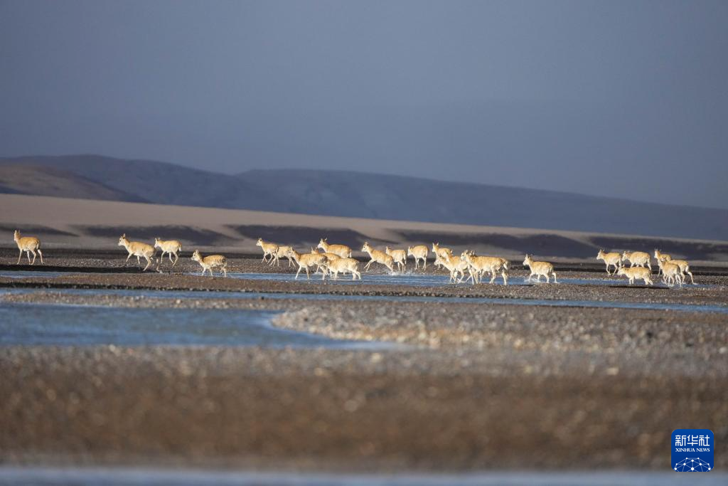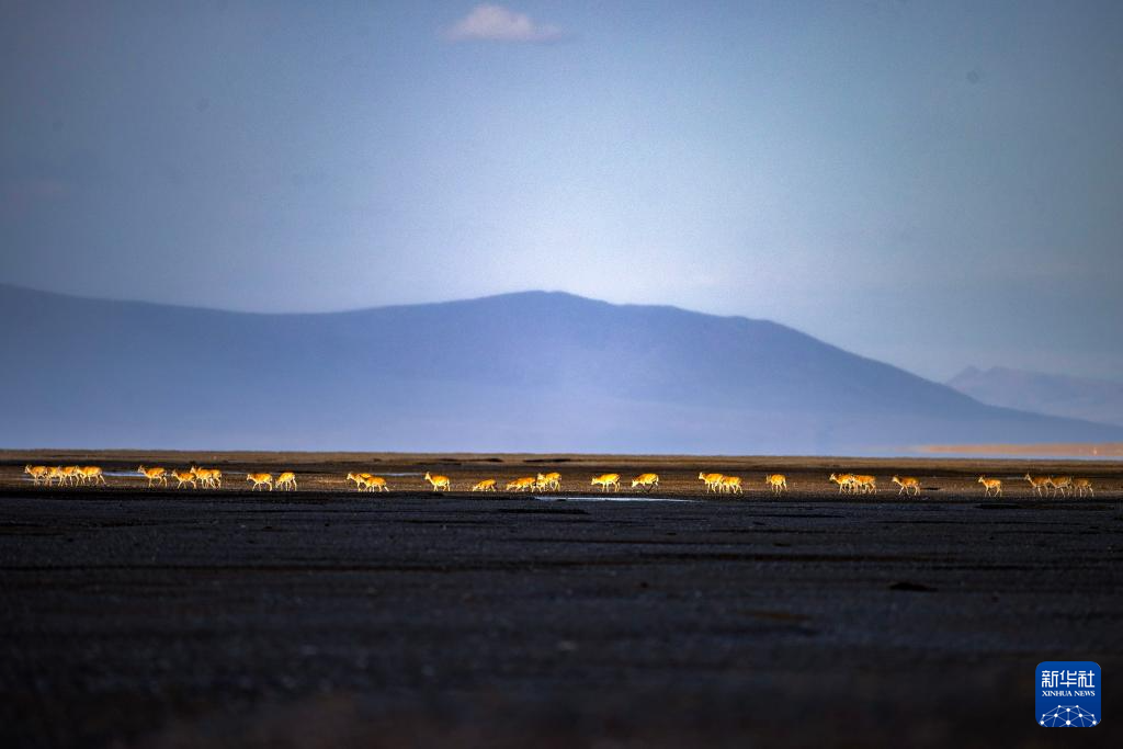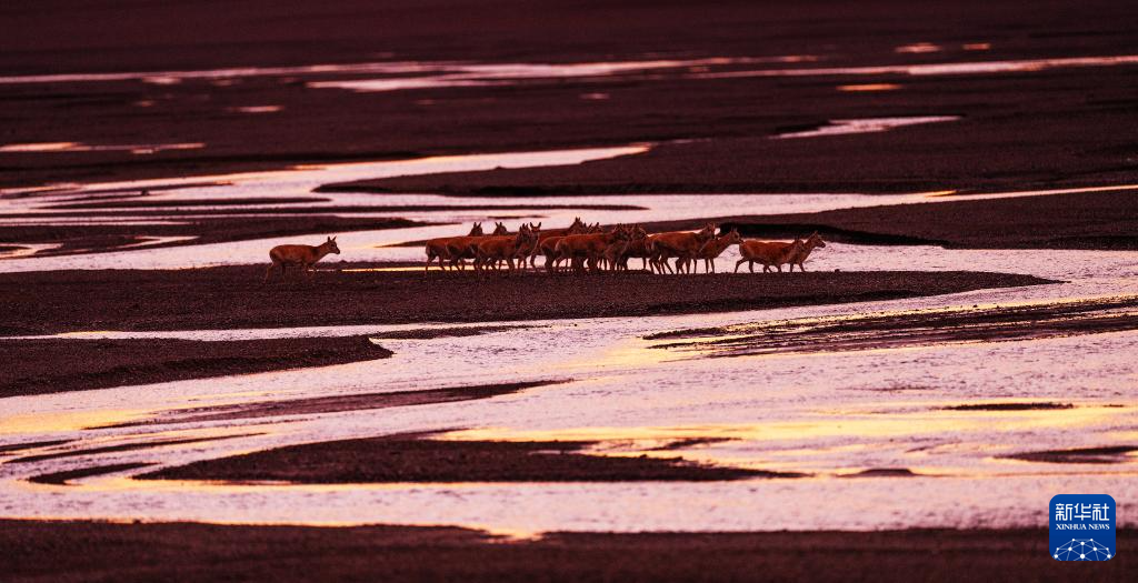 落日余晖中大群迁徙的藏羚羊行进在甜水河畔的荒滩上(6月13日摄)。新华社记者 姜帆 摄