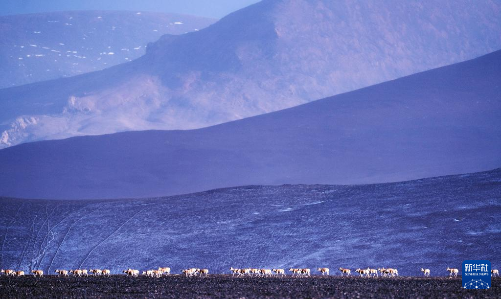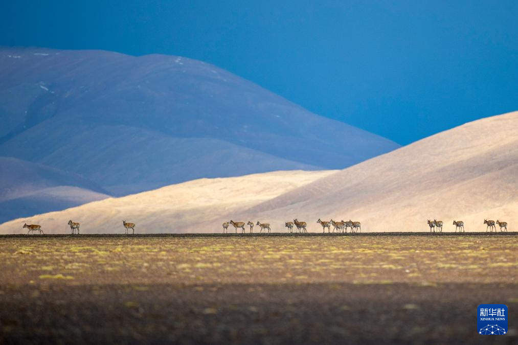 6月13日傍晚,在羌塘国家级自然保护区,一群藏羚羊在迁徙。新华社记者 费茂华 摄