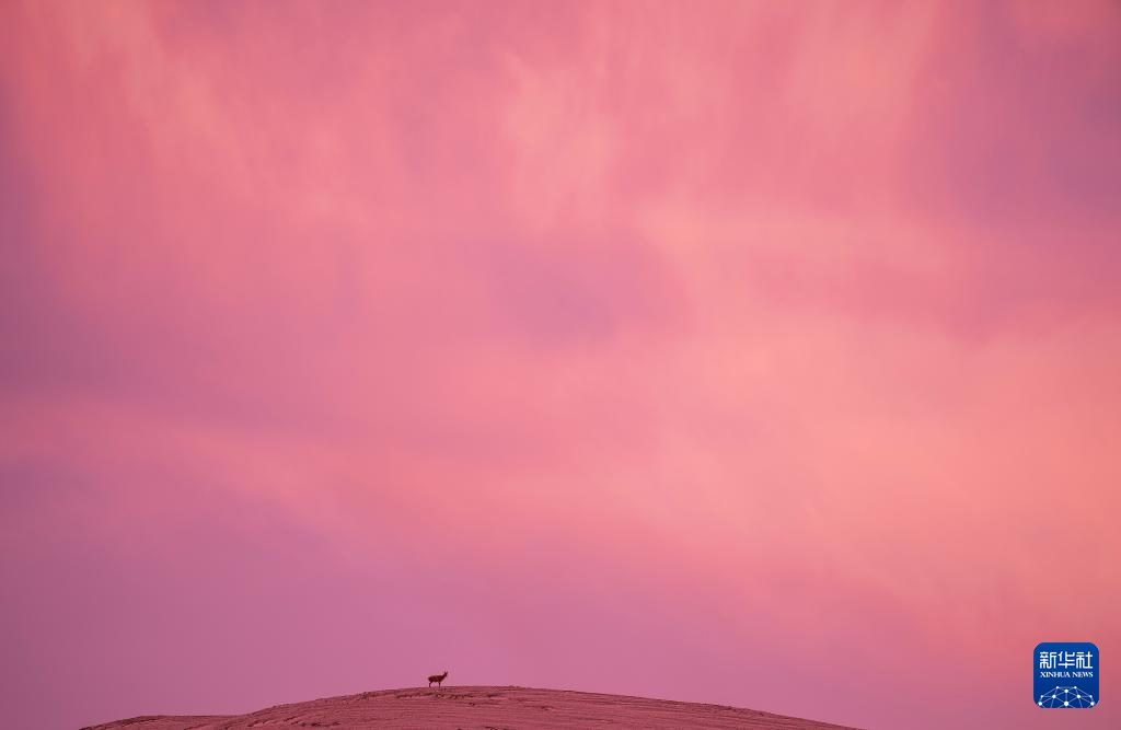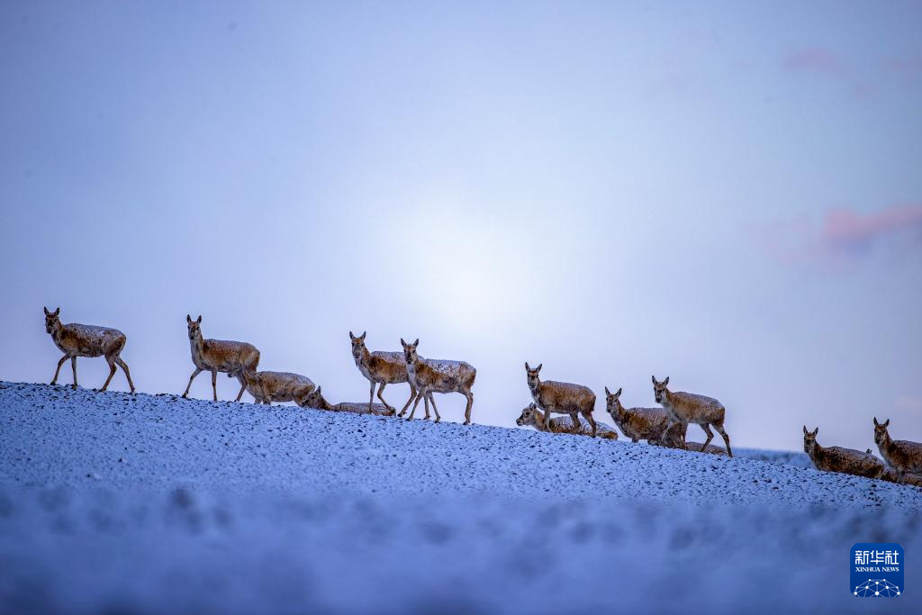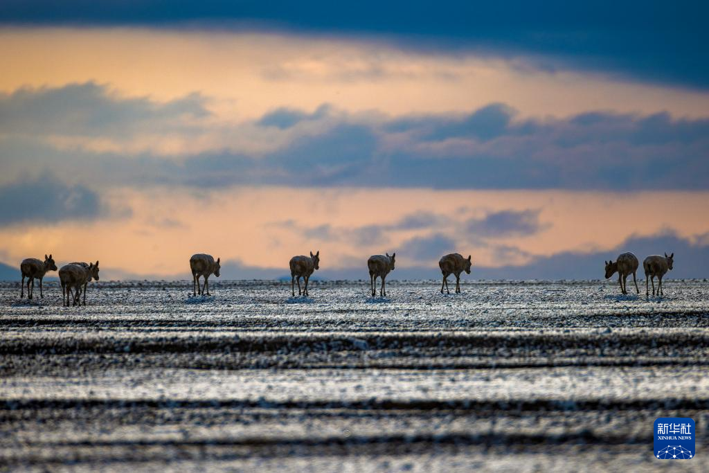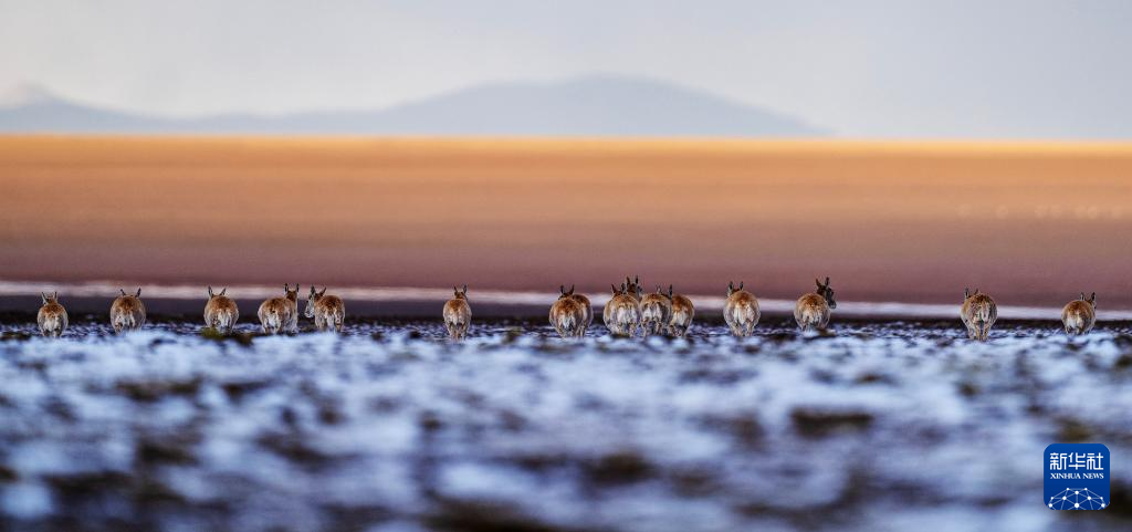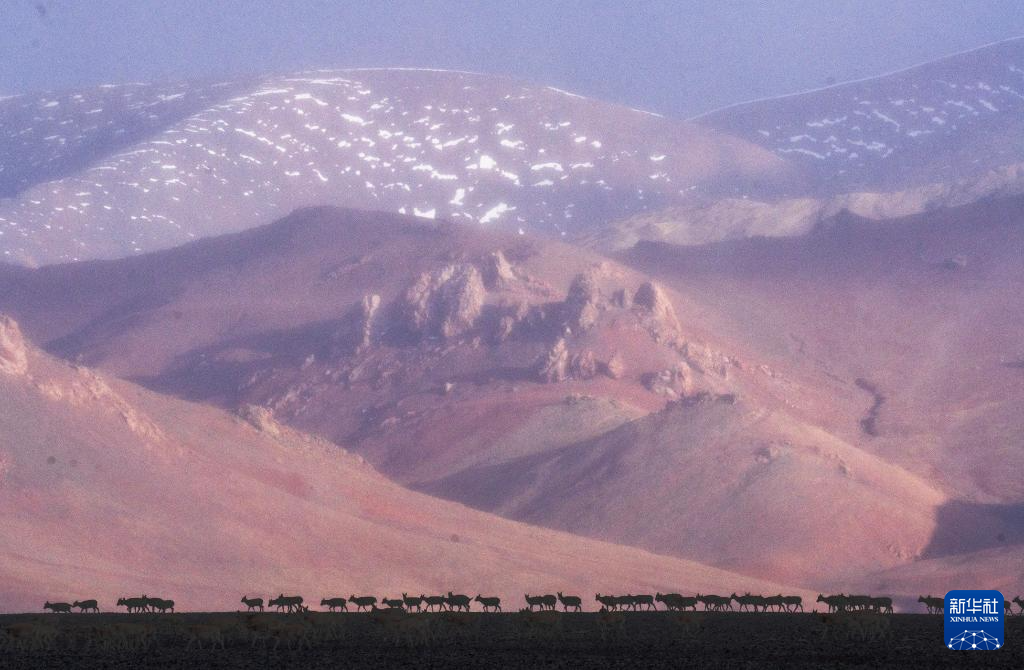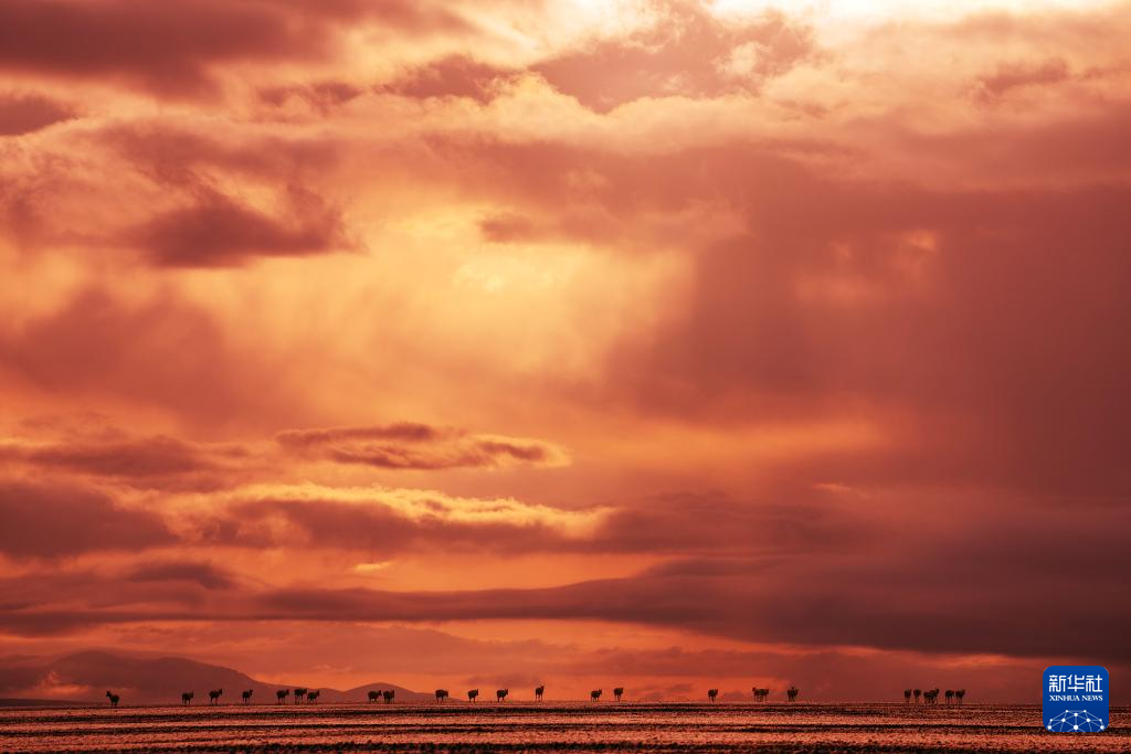 6月15日清晨雪后,在羌塘国家级自然保护区,迎着朝霞前行在迁徙路上的一群藏羚羊。新华社记者 费茂华 摄