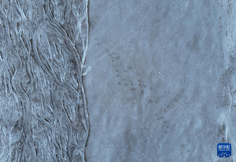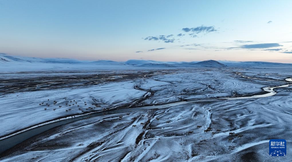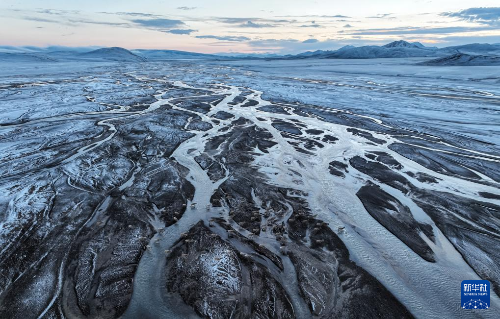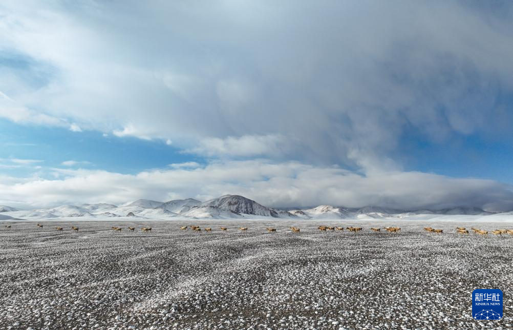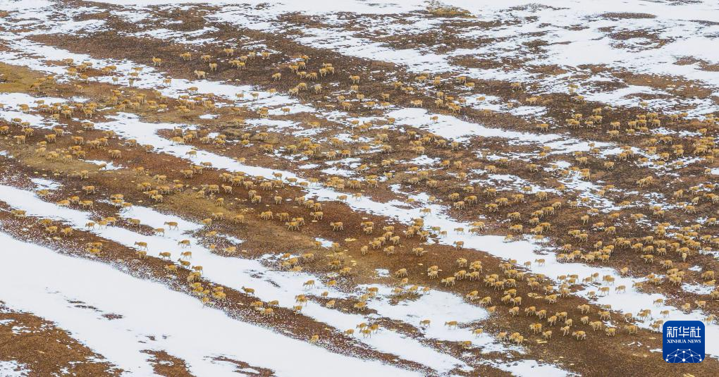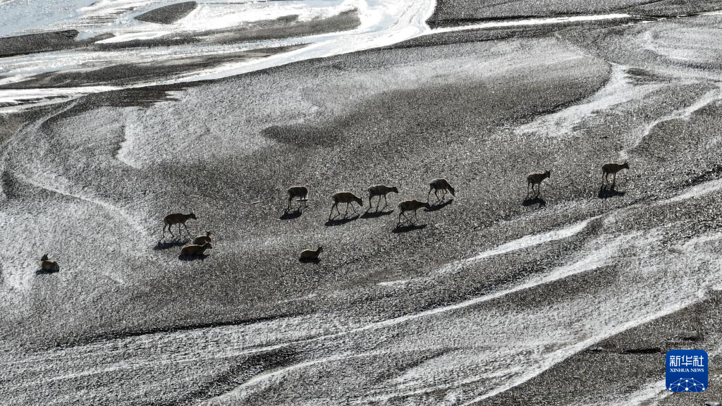 在甜水河畔荒滩雪地中向产羔地迁徙的藏羚羊(6月14日摄,无人机照片)。新华社记者 普布次仁 摄