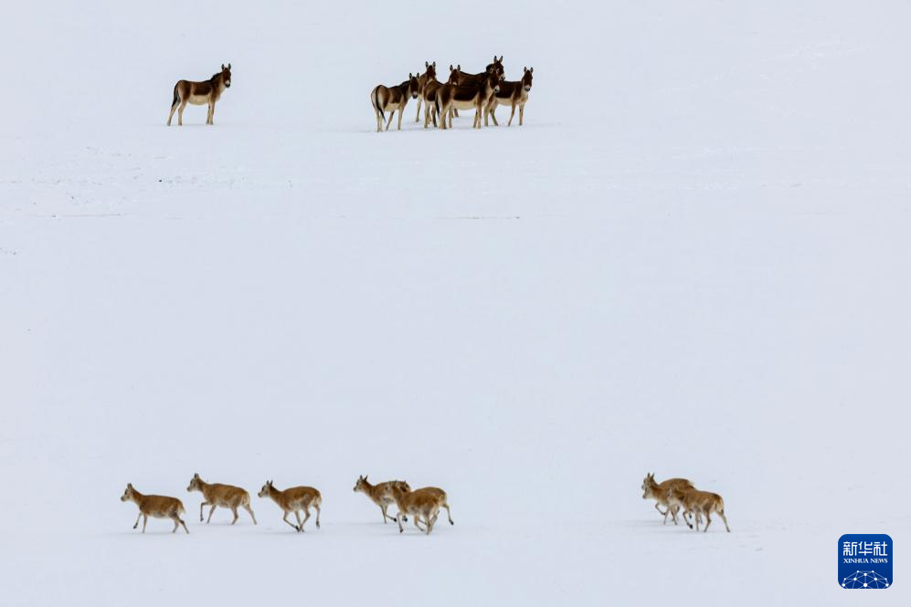一群藏野驴在雪地中注视着迁徙的藏羚羊(5月8日摄)。新华社记者 姜帆 摄
