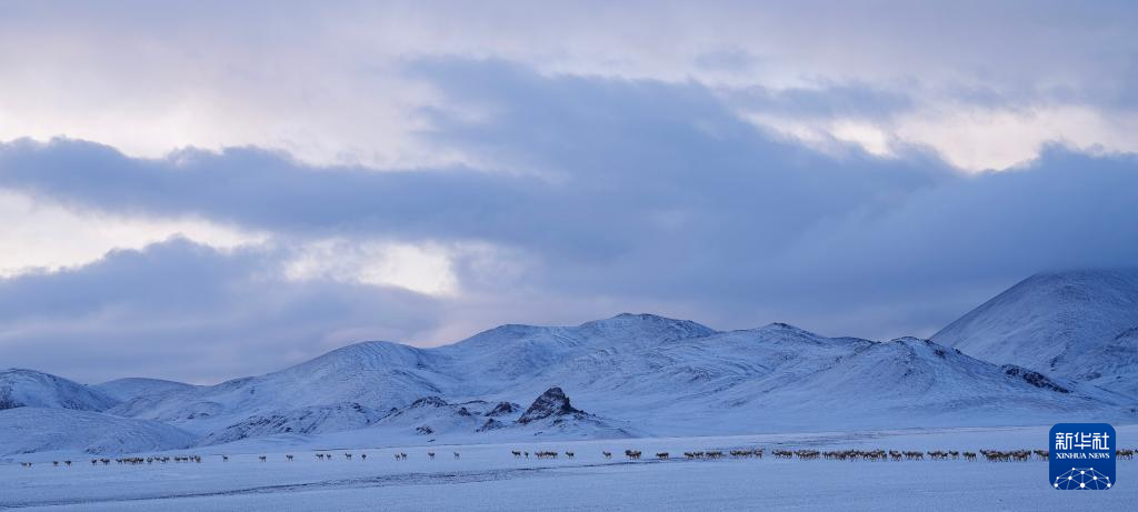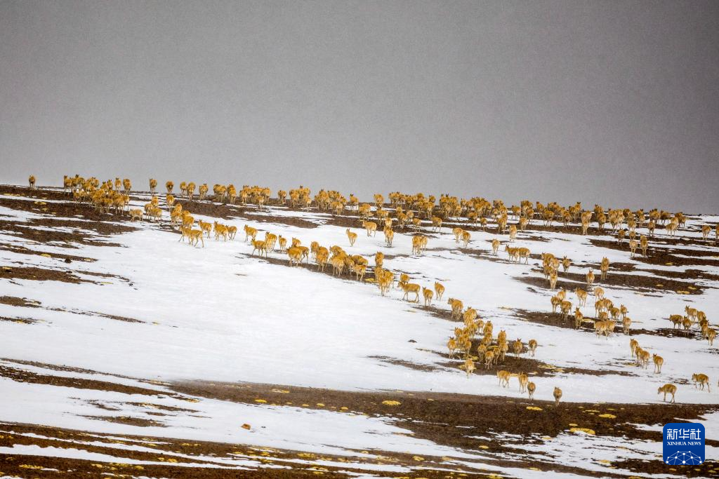 大群迁徙的藏羚羊翻越覆盖着积雪的山梁(5月10日摄)。新华社记者 姜帆 摄