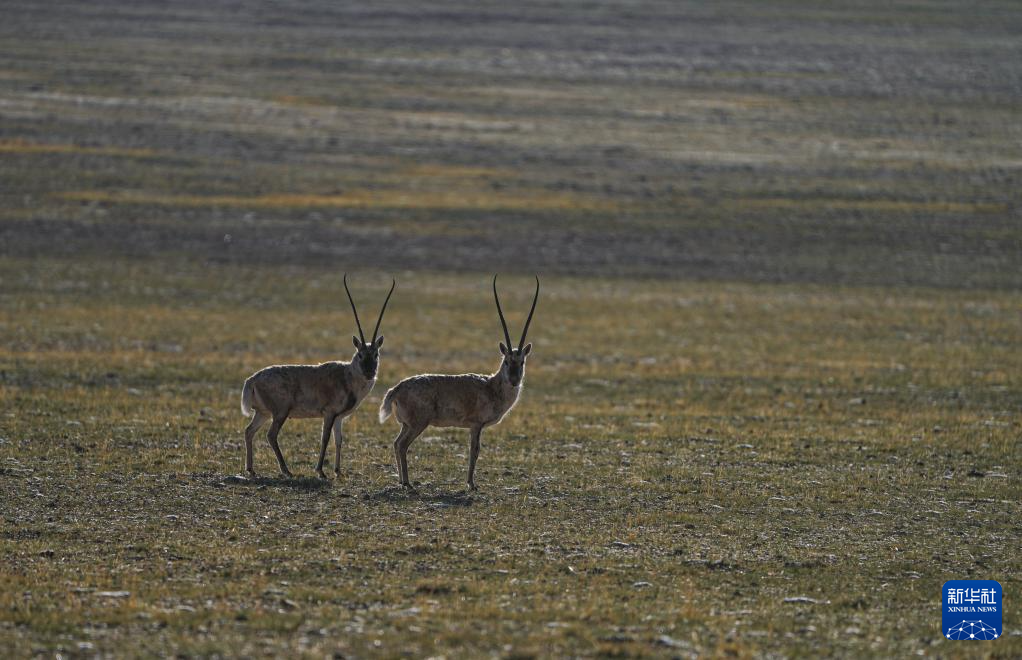 距迁徙的母藏羚羊群不远处,两只公藏羚羊远远地守望着羊群(6月13日摄)。新华社记者 晋美多吉 摄