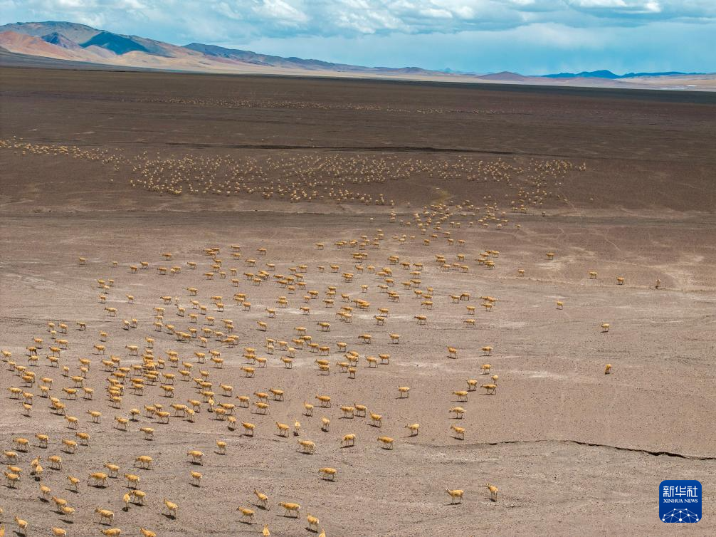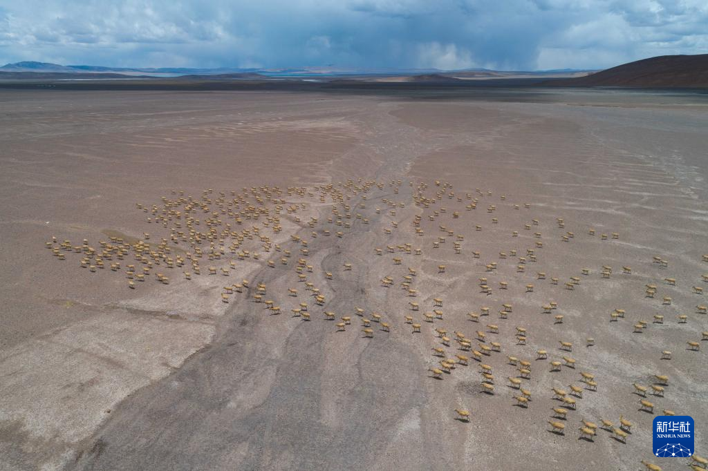 大群迁徙的藏羚羊在羌塘保护区核心区向产羔地迁徙(6月13日摄,无人机照片)。新华社记者 晋美多吉 摄