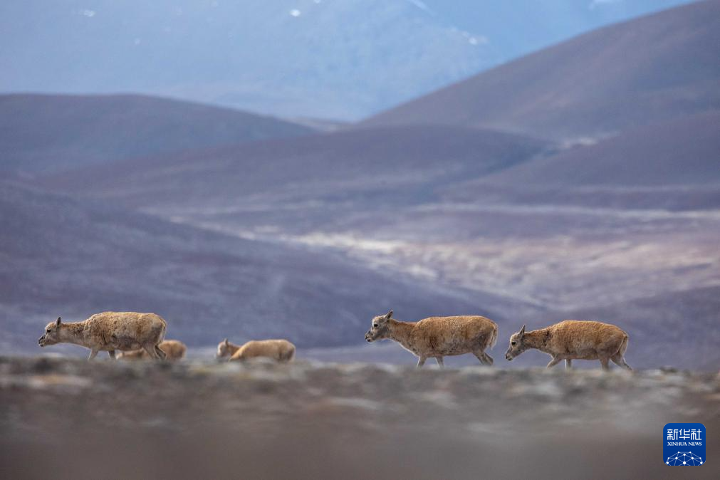 几只公藏羚羊守护母藏羚羊前进(5月8日摄)。新华社记者 姜帆 摄