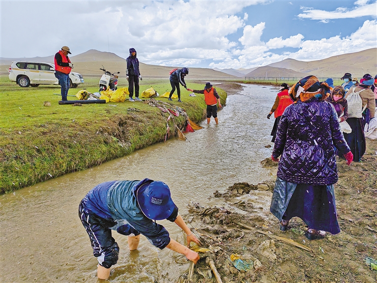 图为志愿者在清理哲古湖畔的垃圾。记者 丹增平措 摄