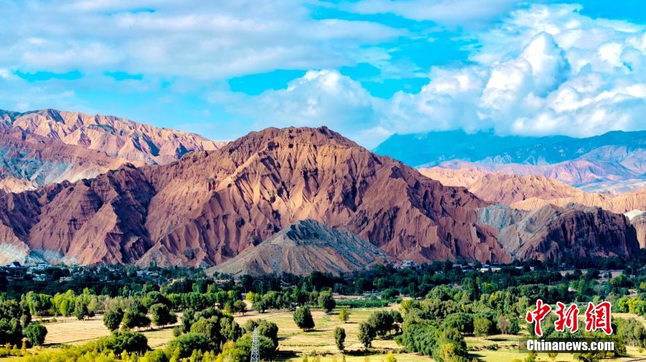 秋日高原,摄影爱好者在黄河上游的青海省海南藏族自治州贵德县境内,航拍贵德国家地质公园的阿什贡七彩峰丛地貌多姿多彩,秀丽壮美。画面中,天高云淡,山峦起伏,黄河在山川中蜿蜒,阿什贡七彩峰丛色彩斑斓,与天空云彩的倒影形成了一幅壮美的山川社稷图景。航拍图为阿什贡七彩峰丛的俊秀山峰。(无人机照片)