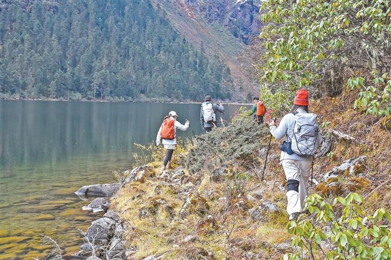 图为游客在萨贡玉错徒步旅游。记者 刘枫 摄