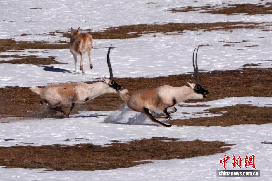 12月19日,西藏那曲市申扎县境内栖息的藏羚羊群。在藏北高原腹地的雪原或草原上,藏羚羊群或追逐打斗,或低头觅食,展现着冬日高原的勃勃生机。图为藏羚羊追逐打斗。中新社记者 李林 摄